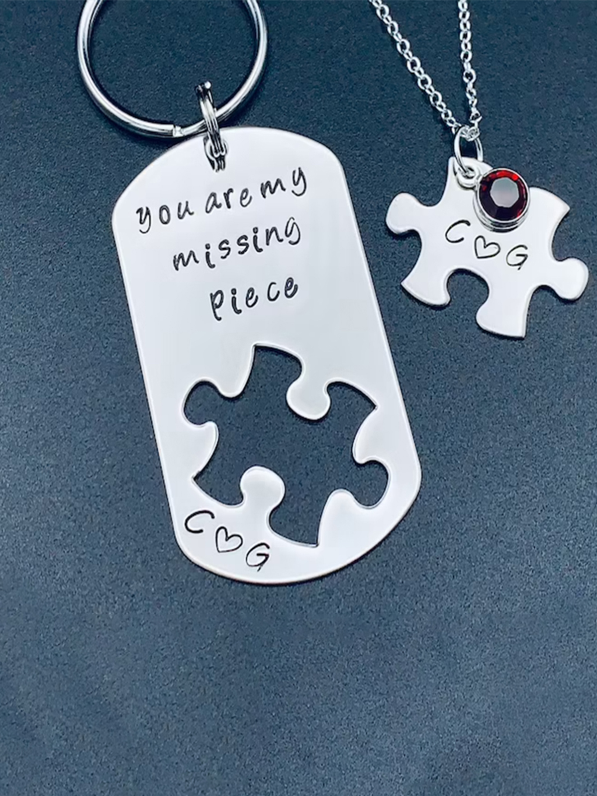 This is a set including a dog tag style keychain, in which the puzzle part has been cut and turned into a necklace. If space permits, this can be personalized to say anything you want. Both pendants are made of stainless steel.