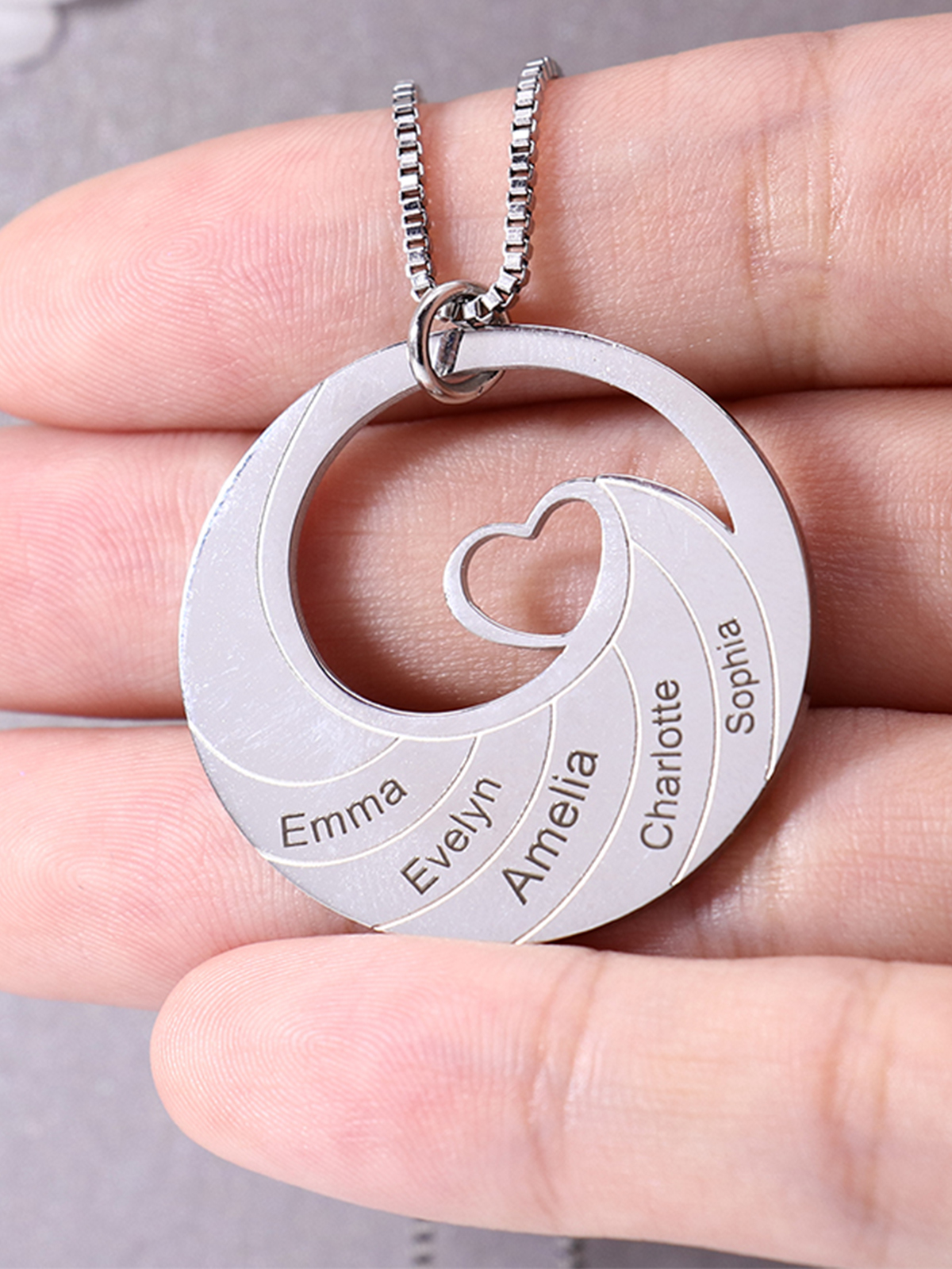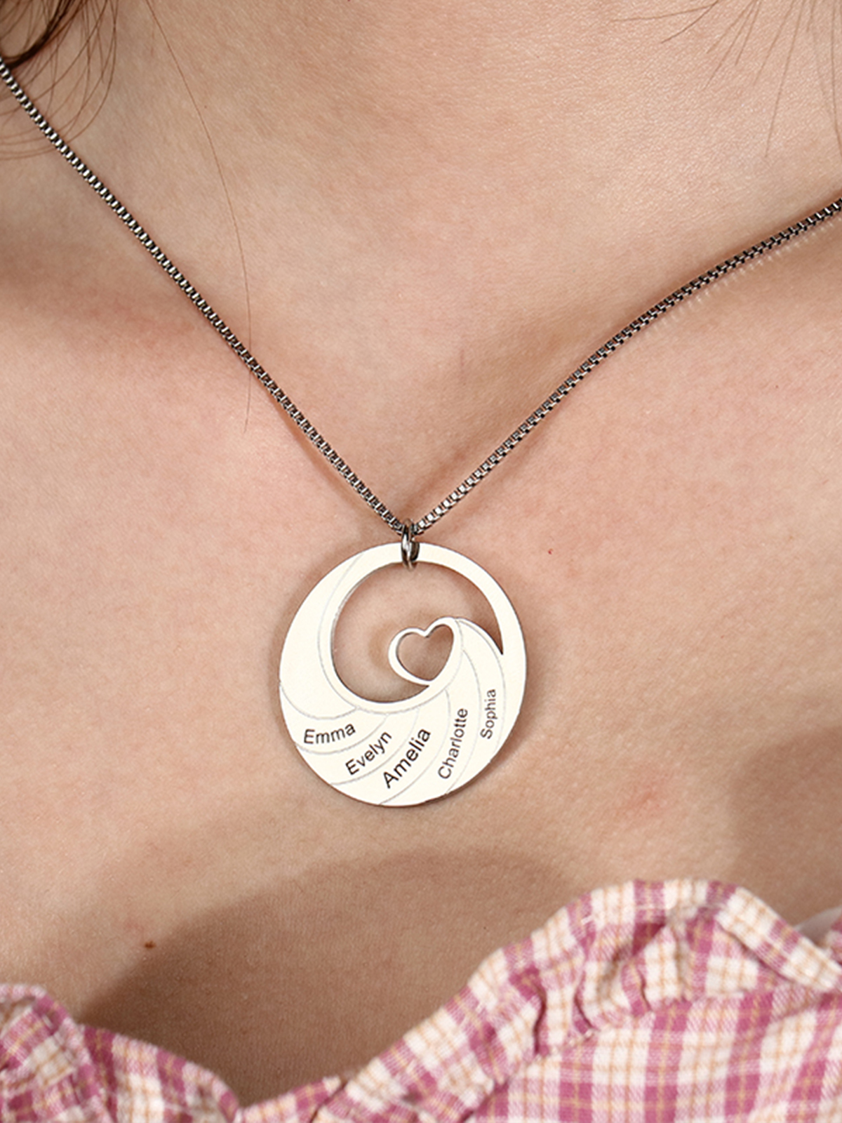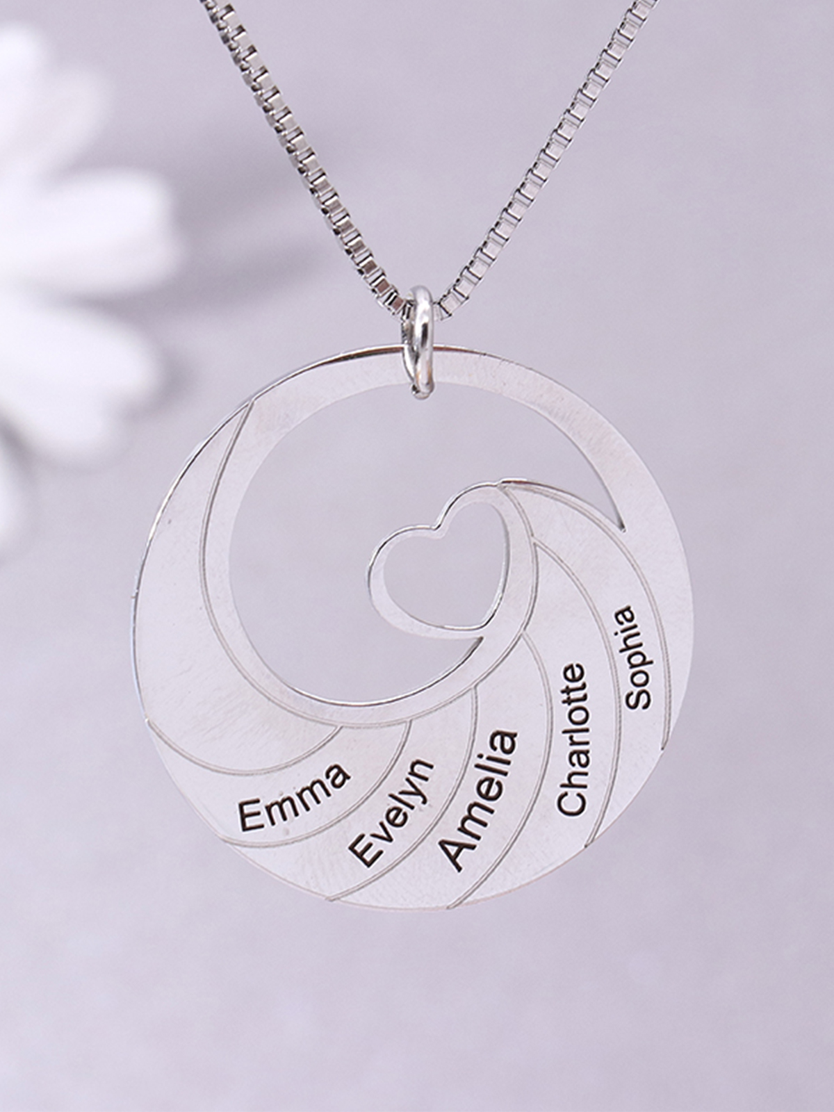 A simple and whimsical silver round spiral necklace. Decorating or dressing up is intended to inspire the wearer to celebrate life and freedom. Choose the number of names you want, the shiny spiral necklace makes the wild place close to your heart